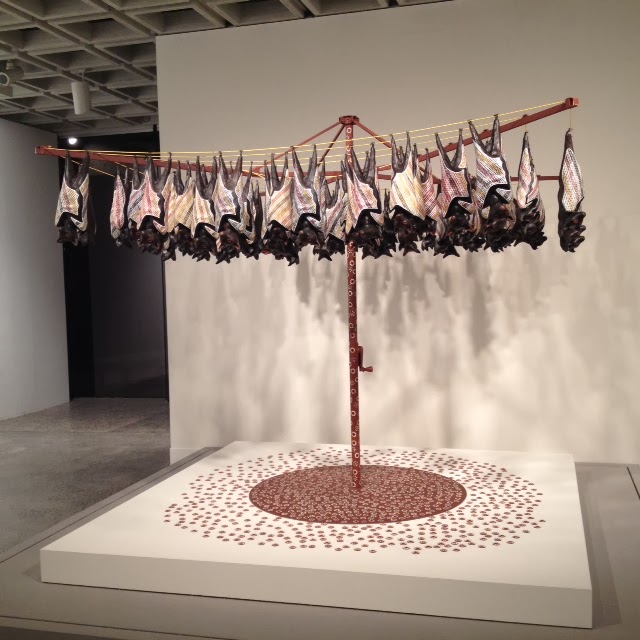 As I said about this image, it comes so close to being a perfect replication of the underlying intention in Kim Scott’s That Deadman Dance: here too is the amazing indigenous capacity of transforming ugly technology into a thing of beauty. Just as in Deadman it was Bobby’s capacity as a dancer that transformed the military dance of death into a dance that united people into a new life, so here, in Lin Onus’s work, the ubiquitous Hills Hoist, scarring the landscape of suburban Australia as far as the eye could see, is now covered in individually carved and painted fruit bats, complete with their droppings miraculously transformed into flowers! What a blast!