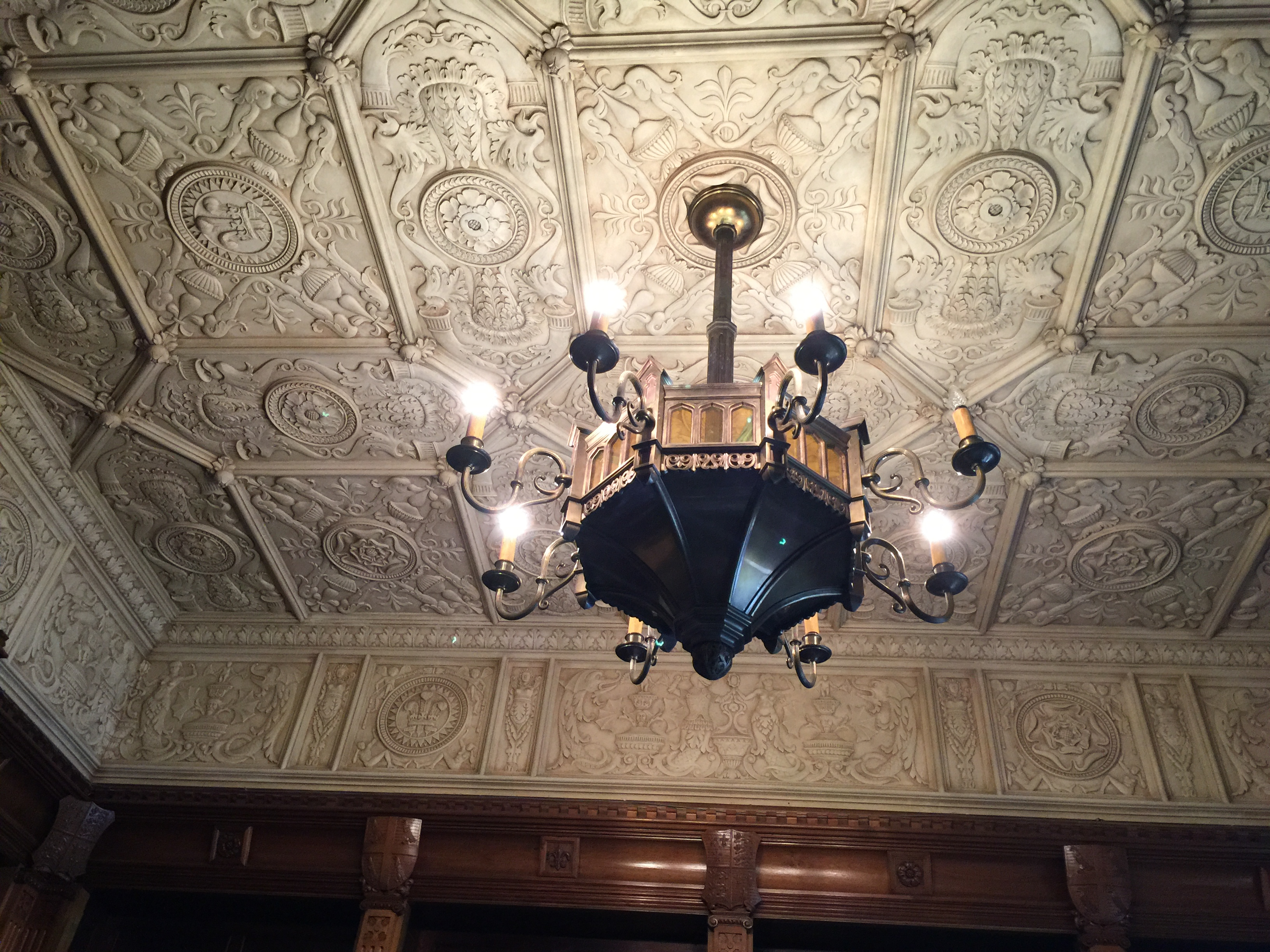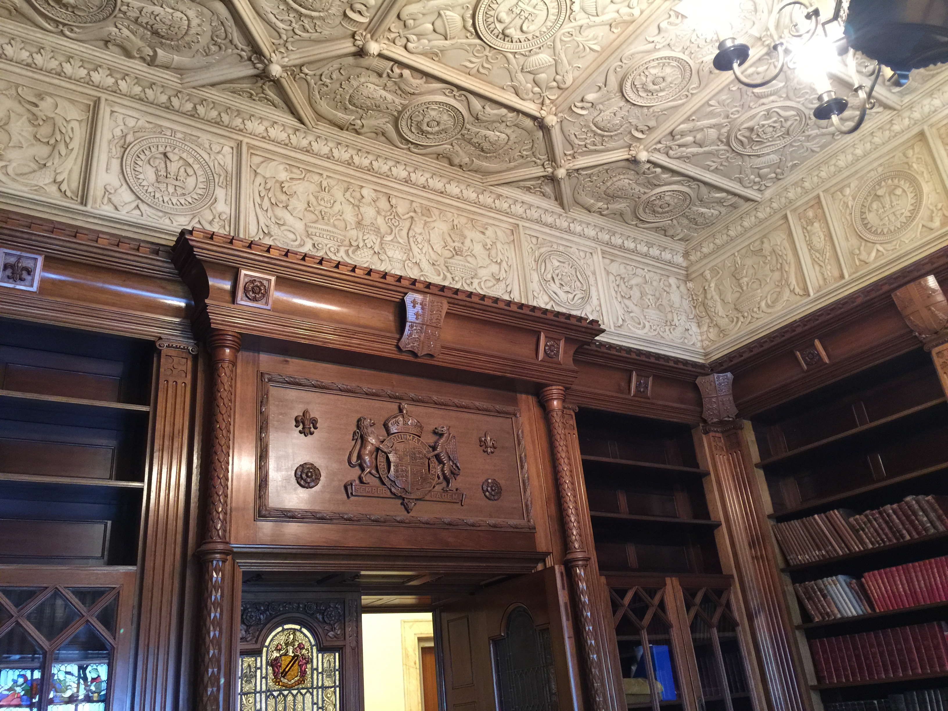 We visited the Shakespeare Room in the State Library today. This room is a wonderful expression of how much Shakespeare has meant to the Australian colony since the time of Captain Cook. One of the first plays ever to be produced in Sydney was in fact Henry IV with a complete convict cast! When you get to know the play you will realise how revolutionary that whole concept is. The play is in many ways an assault on the hierarchy in the way it dares to present the drunken, licentious world of Falstaff as more vital, alive than the world of politics and Kings. At heart Shakespeare was a subversive and this side of him fits in so well with a certain strand of republicanism in Australia. The Shakespeare Room, planned and funded by the Shakespeare Society began its journey into being in 1900, but because of the First World War it took another couple of decades till it all came into existence. The room itself is designed on Elizabethan principles and is modelled on a room in the palace of Cardinal Wolseley. Here is the magnificent plaster ceiling with Chandelier: