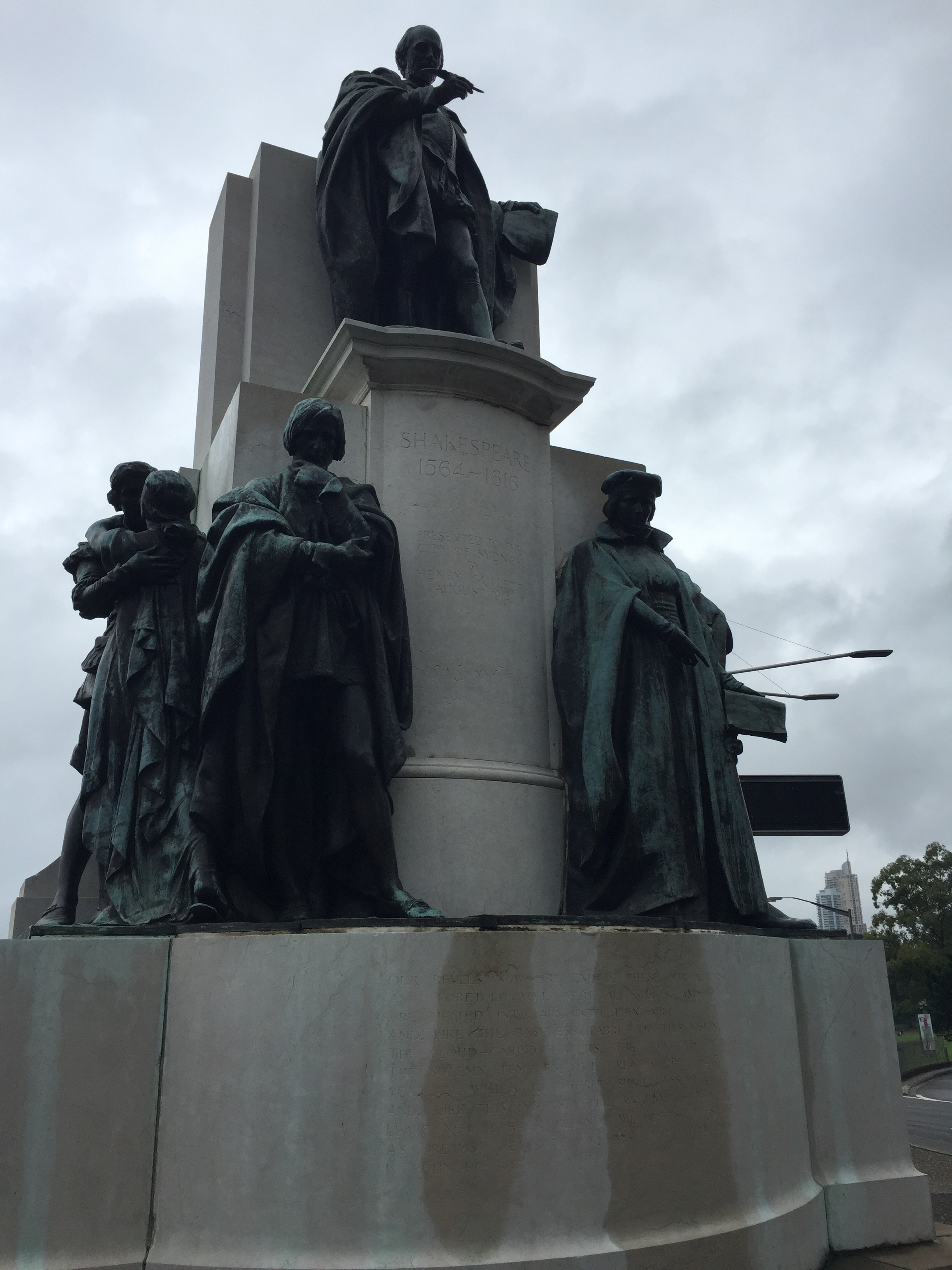 And here is the wonderful Shakespeare Statue which is directly beyond the stained glass windows. It used to stand in what was originally “Shakespeare Place”, but is now between two arms of the Cahill Expressway: such the price of progress. The statue is worth a close visit. It has inscribed on it the most memorable lines from The Tempest about the impermanence of the theatre; this acts as a metaphor for Shakespeare’s heart felt sense of the impermanence of life, for which we need to be deeply grateful, treasuring it for the short time that it is given to each of us: “We are such stuff. As dreams are made on; and our little life. Is rounded with a sleep.” The big fat guy on the right is Falstaff- who we will have the good fortune to get to know much better later next week.