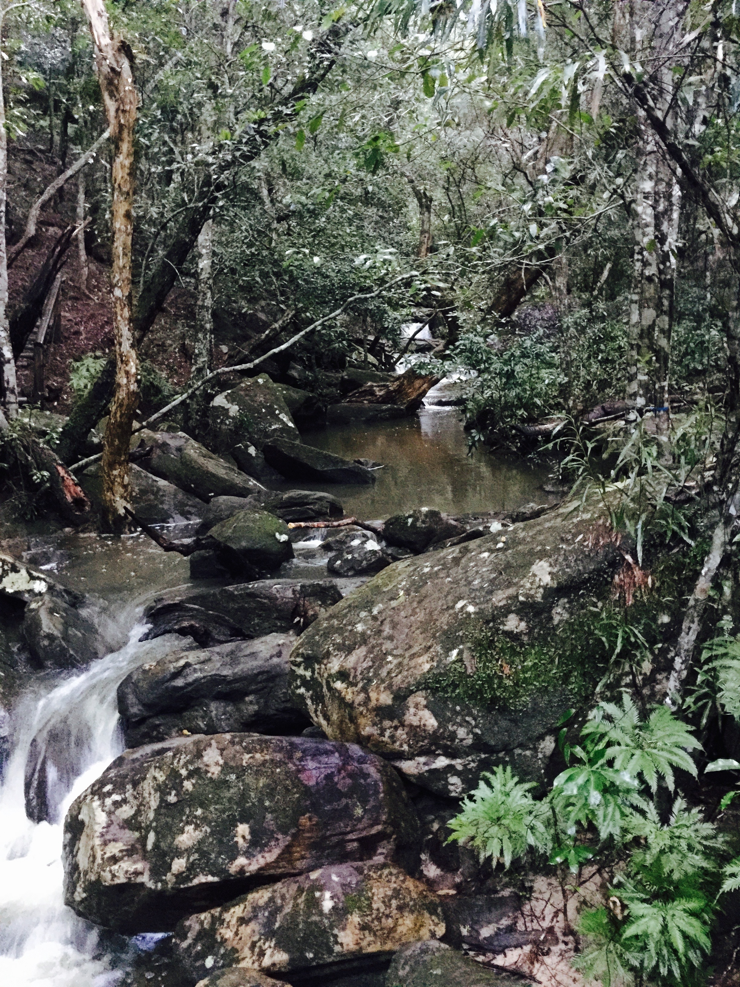 It was dark almost all the way down, but we followed the sound of the roaring creek below and entered this amazing confluence of three creeks pouring the capacious night’s rain down into Berowra Creek. By the time we got to the bottom morning light had arrived: