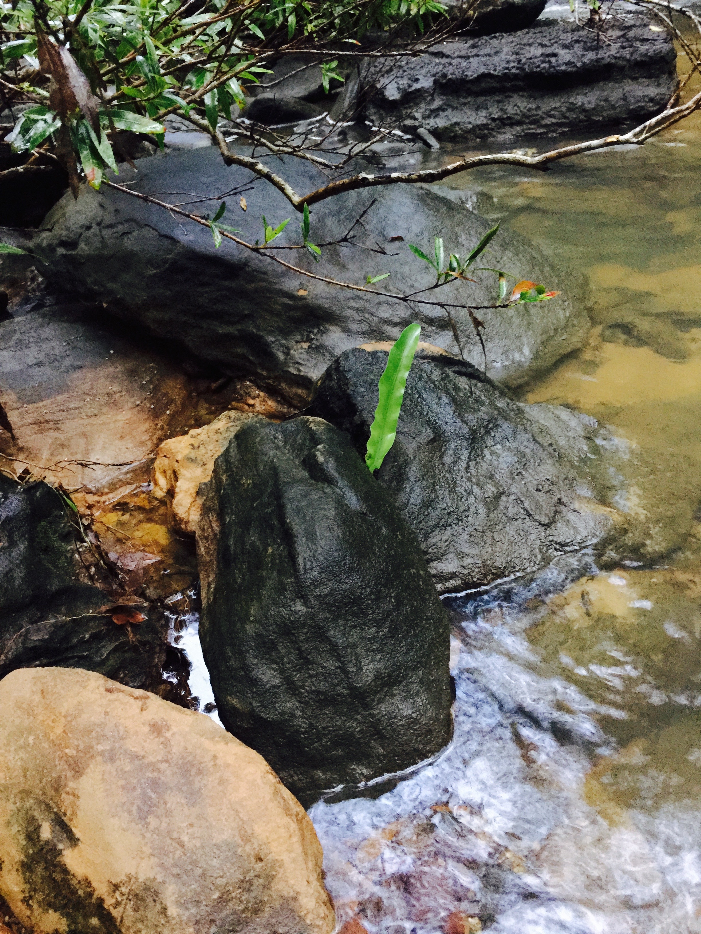 Amidst the rocks a single stem of a bird’s nest fern (Asplenium australasicum)struggling into existence: