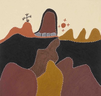 © Shirley Purdie, Gurragurrag, 120×120 cm, natural ochre and pigment on canvas, 2013, courtesy Warmun Art Centre.
