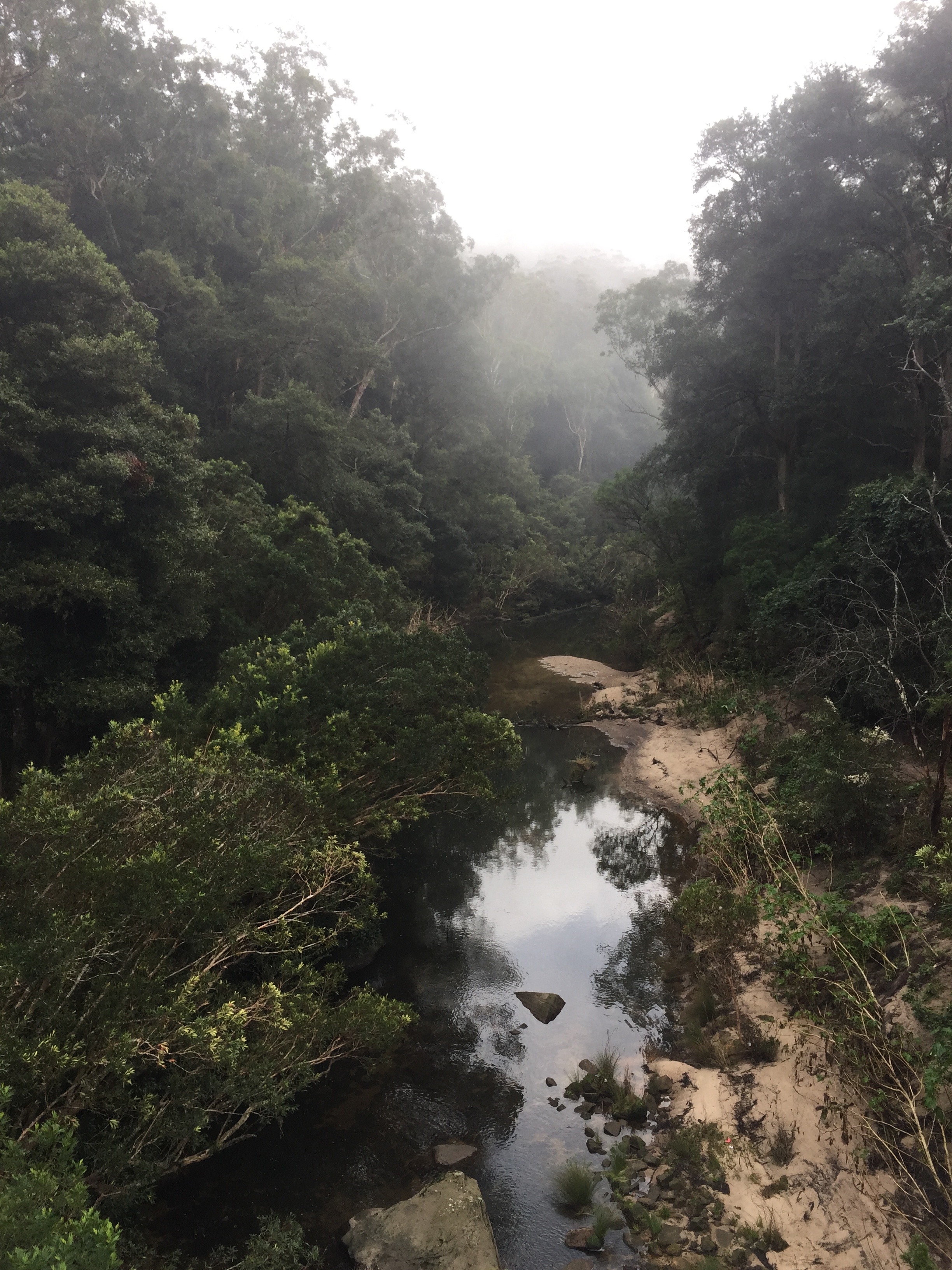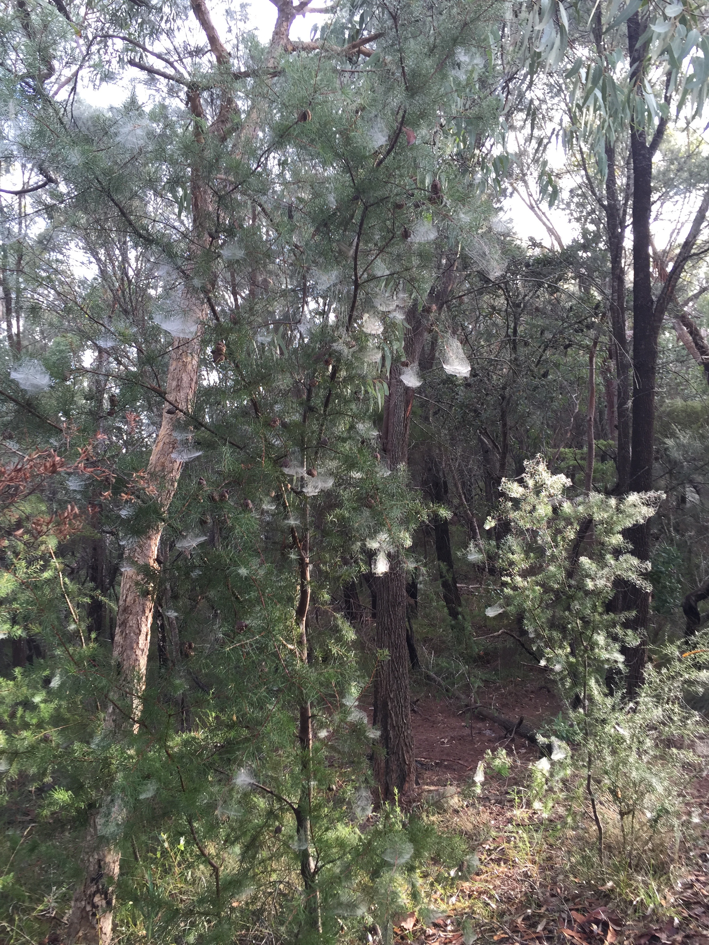 And on the way down again to Galston Gorge itself the mist has wreathed all the thousands of spiders webs in the hakeas and the she oaks, bringing their existence into focus: