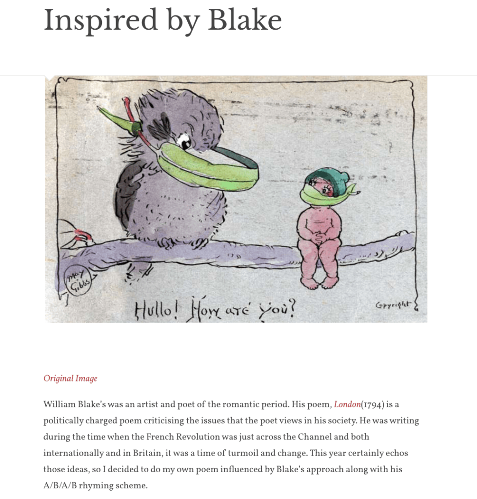 Nineteenth, x Blogging Some great blogs by 19th Century students in their first three weeks of studying the Romantics by michaelgriffith1 • March 27, 2020 • 0 Comments Thank you Laura for this sobering view of our current situation from a Romantic perspective framed by our fearless May Gibbs. For more from Laura see: https://lauranash1.wordpress.com/ Share this: Click to share on X (Opens in new window) X Click to share on LinkedIn (Opens in new window) LinkedIn Click to email a link to a friend (Opens in new window) Email Click to share on WhatsApp (Opens in new window) WhatsApp Click to share on Facebook (Opens in new window) Facebook More Click to share on Reddit (Opens in new window) Reddit Click to share on Pinterest (Opens in new window) Pinterest Click to print (Opens in new window) Print Click to share on Tumblr (Opens in new window) Tumblr Click to share on Pocket (Opens in new window) Pocket Like Loading...
