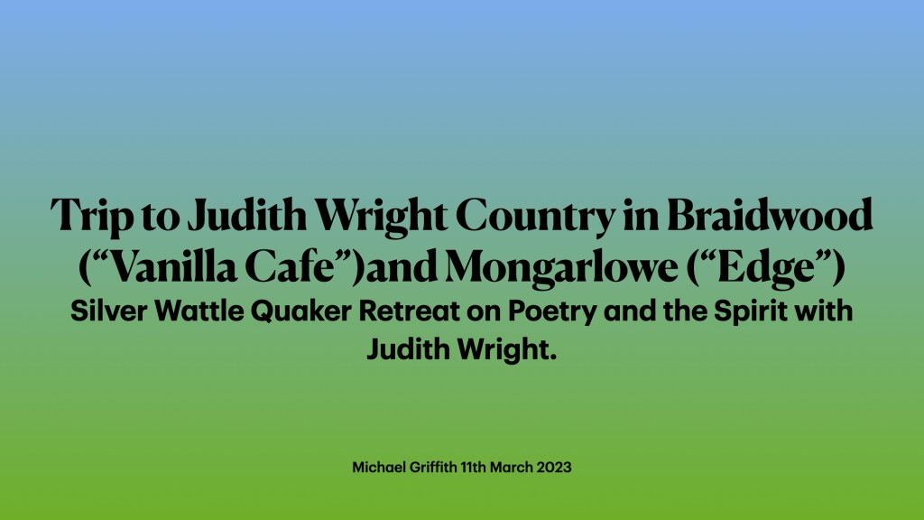 Judith Wright: Poetry and Spirit, x Blogging At Edge- Visit of Silver Wattle’s Poetry and the Spirit Group to Judith Wright’s cultural and natural environments in and around Braidwood. by michaelgriffith1 • March 11, 2023 • 0 Comments Share this: Click to share on X (Opens in new window) X Click to share on LinkedIn (Opens in new window) LinkedIn Click to email a link to a friend (Opens in new window) Email Click to share on WhatsApp (Opens in new window) WhatsApp Click to share on Facebook (Opens in new window) Facebook More Click to share on Reddit (Opens in new window) Reddit Click to share on Pinterest (Opens in new window) Pinterest Click to print (Opens in new window) Print Click to share on Tumblr (Opens in new window) Tumblr Click to share on Pocket (Opens in new window) Pocket Like Loading...