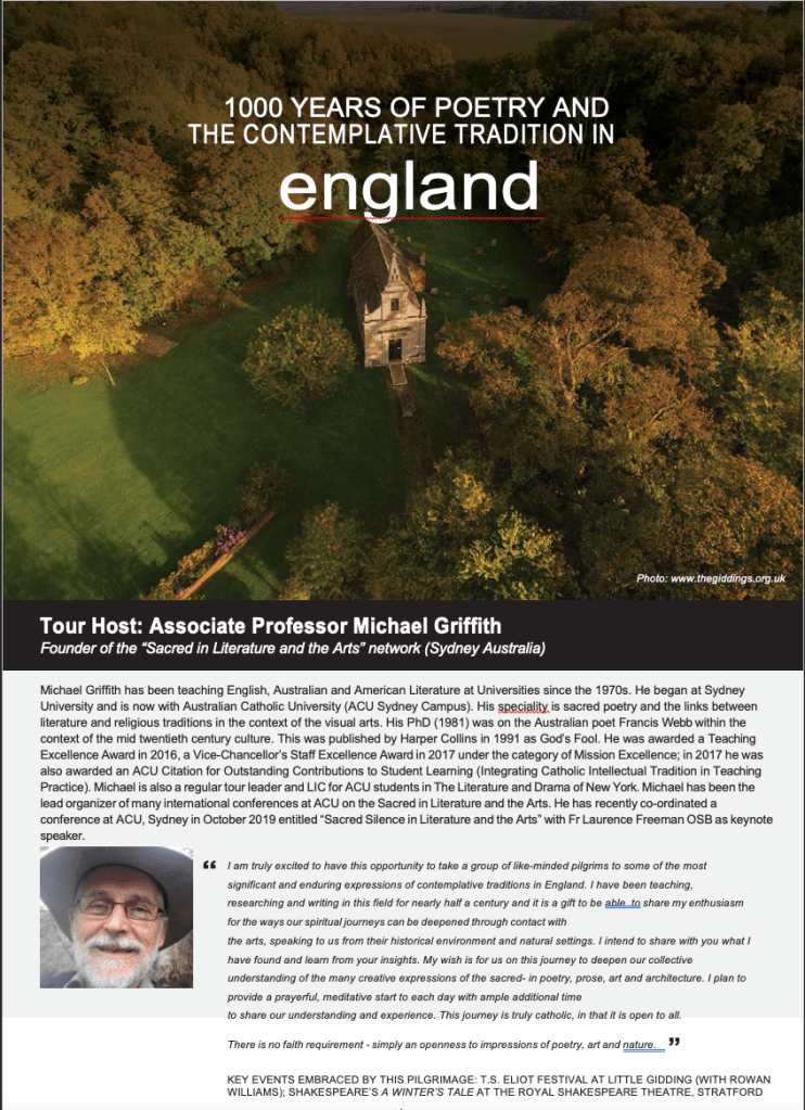Contemplative England: If you wish to find out more about this pilgrimage then please either contact me (Michael Griffith) direct, or contact the tour organizers: StudyTours@reho.com- contact Bianca there! Find a facebook link to the full program here: https://www.facebook.com/236874819730378/posts/2911099475641219/ and a downloadable brochure here: